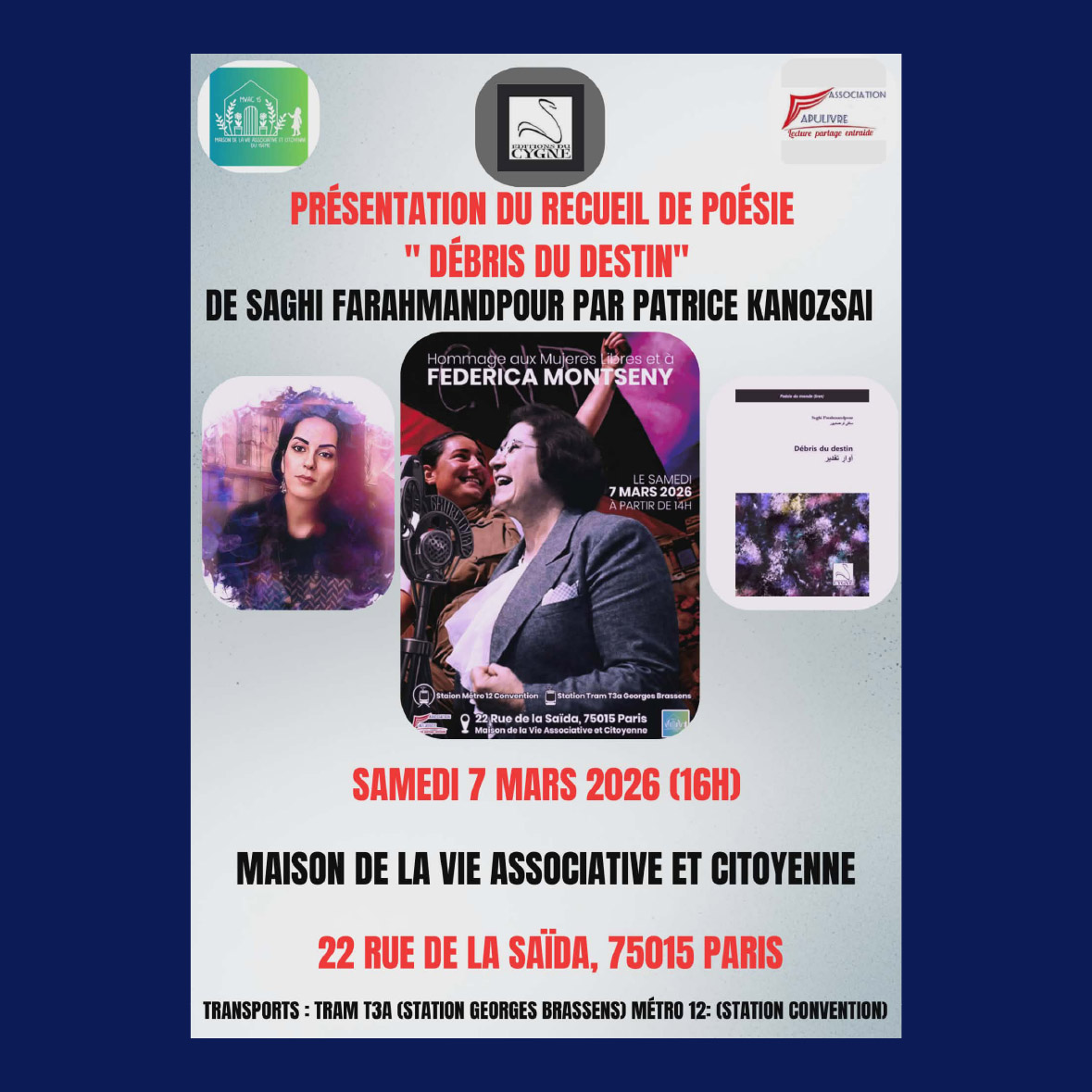 Rencontres Apulivre à l'occasion de Journée internationale de lutte pour les droits des femmes Lecture de "Débris du destin", recueil bilingue français/persan de la poétesse iranienne Saghi Farahmandpour |